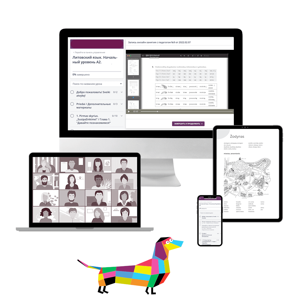 Мы адаптируем материалы учебника под студентов, для которых литовский язык не родной. Также мы трансформируем интенсивность программы — обучение онлайн занимает всего 4 месяца.